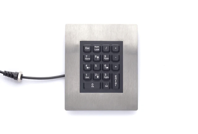 The PM-18 is an 18-key numeric pad by iKey that is protected in a stainless steel case and is easily integrated into any system. When properly sealed, the PM-18 is engineered to meet NEMA 4X specifications. It features navigation keys and the secondary legend can be accessed by pressing the NumLock key. It is also possible to cascade a secondary keyboard if necessary.